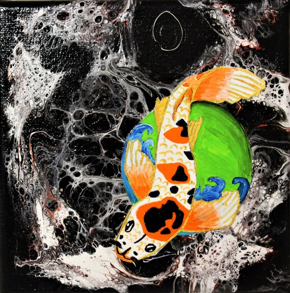 6x6 Canvas Koi Fish Acrylic Painting Over An Acrylic Pour Painting Etsy